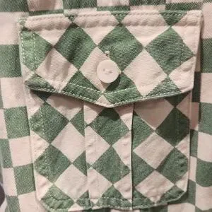 Chic checkered jumpsuit with short sleeves. Button-up front design. Front pockets