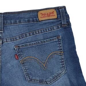Levi's women's denim shorts in a classic blue wash. These mid-rise shorts feature a comfortable stretch fabric, cuffed hems, and a traditional 5-pocket design, making them perfect for casual outings. Condition is excellent, no rips, holes, or stains. Please note this is a second-hand piece and may show signs of normal wear. Please see pics for the most accurate condition.