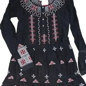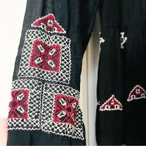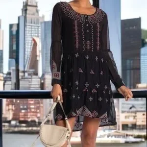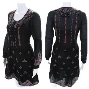 A stylish embroidered design gives a boho-hippie feel to this chic dress. - Scoop neck - Long sleeves - Front partial button placket - All over embroidered design