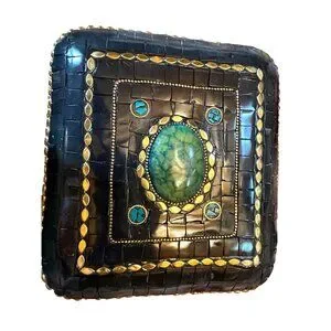 Indulge in the allure of this exquisite Ramla clutch, a masterpiece of Moroccan craftsmanship. Adorned with a stunning green gemstone and luxurious gold accents, it exudes elegance. A true statement piece, own a piece of art that complements your sophisticated style.