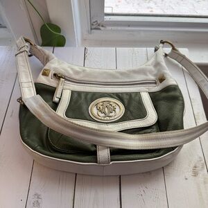 Soft pebbled leather crossbody with olive green and cream tones. Features a front pocket and adjustable strap. See photos for measurements.