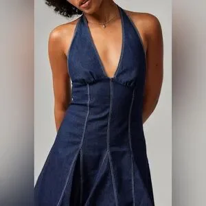 Sophisticated dark blue halter dress with a flared design. Ideal for casual events.