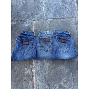 The product is a lot of three pairs of Wrangler Retro Slim Medium Wash men's denim jeans in size 30 with a 32-inch inseam. These medium wash blue jeans feature a slim fit and bootcut style, making them perfect for a Western country-inspired look. The Wrangler Retro product line ensures quality and durability, while the slimming features make them a stylish and flattering choice for any man's wardrobe. Perfect for showcasing your favorite country-inspired theme in a classic denim style.