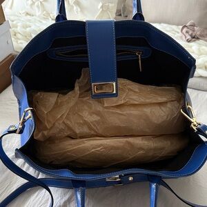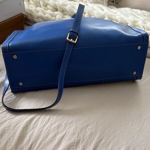Mint condition, genuine, Italian blue leather bag with light gold hardware. Comes with adjustable Crossbody strap, protectors for placement, perfect for a work bag