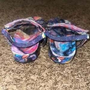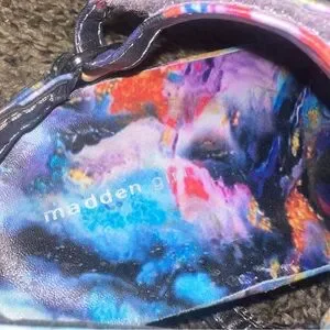 Embrace a cosmic-inspired look with Madden Girl's stunning sandals, featuring a vibrant blend of purple and blue hues. These open-toe sandals are designed with adjustable dark blue straps, offering both style and comfort for casual summer outings. The dreamy, space-like aesthetic makes them a standout choice for any warm-weather ensemble.