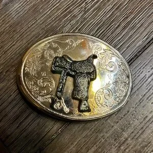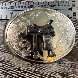VERY COOL OVAL VINTAGE WESTERN GOLD BUCKLE WITH SILVER SADDLE. Horse Saddle Trophy Belt Buckle Vintage Chambers Rodeo Cowboy Western Wear