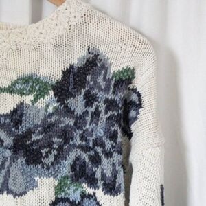 Features: Hand-knit construction, crew neckline, long sleeves, floral pattern