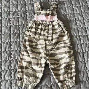 Charming overalls with a camouflage design. Features a pink bow for a cute touch.