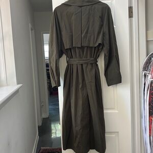 Stylish olive green trench coat. Classic design with a modern twist. Perfect for layering. Water repellent.