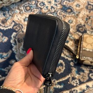 Elegant black wristlet with vibrant multicolor Coach logo. Features a convenient strap.No call outs
