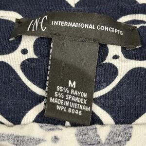 The INC International Concepts Navy White Sleeveless Scoop Neck Jersey Knit Dress in size M is a stylish and versatile piece perfect for various occasions such as parties, casual outings, or even business meetings. The dress features a geometric pattern in blue with a scoop neckline and dolman sleeves, offering a classic and chic look. Made from a comfortable blend of spandex and rayon, this knee-length dress has a pullover closure and comes with a belted waist for added flair. With its timeless design and quality construction, this dress is a must-have for any woman's wardrobe.