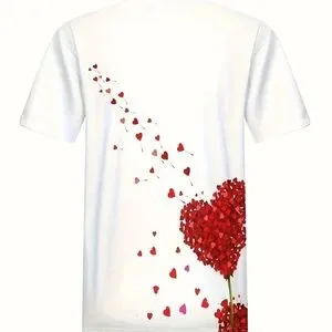 This fun and stylish short-sleeve tee features a crisp white base with a bold heart-shaped graphic made of tiny red petals. The design shows little red hearts and arrows flowing outward, giving it a playful, romantic vibe. Perfect for casual wear, Valentine’s Day, or simply adding a touch of love to your everyday outfit.