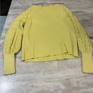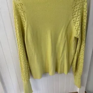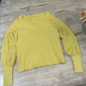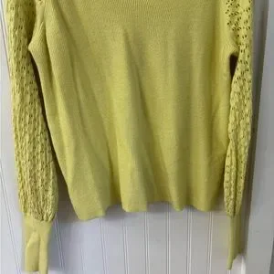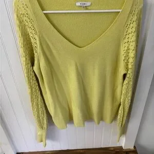 Elegant V-neck sweater by Sioni. Bright yellow color. Features intricate sleeve design. Perfect for any occasion.