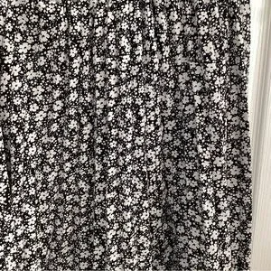 Elegant floral design in black and white. Ideal for versatile styling. Rayon fabric. Soft pleats.