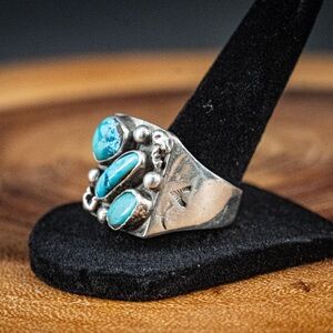 This one-of-a-kind artisan ring features three natural turquoise cabochons set in solid sterling silver, accented with silver beads and organic texturing for a dramatic Southwestern look. The ring is substantial, weighing 21.6 grams, with a large square face that makes a powerful statement.