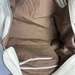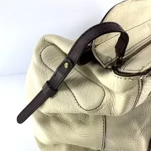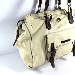 This Ellen Tracy cream handbag features stylish brown accents, lots of pocket storage perfect for any occasion. Its sophisticated design makes it a versatile addition to your wardrobe.