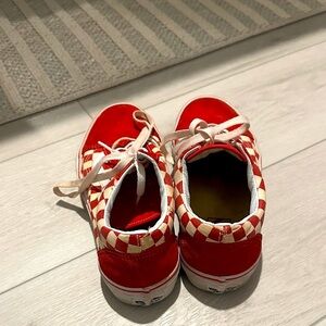 Stylish Vans shoes with a red and cream checkered design. Features classic lace-up style.
