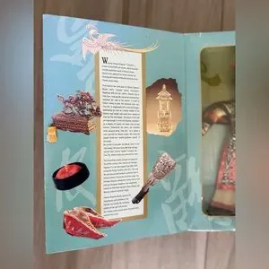 The Barbie The Great Eras Chinese Empress Doll from 1996 by Mattel is a vintage collectible featuring a black-haired Barbie doll dressed as a Chinese Empress. This fashion doll comes with an outfit and has brown eyes, a light complexion, and belongs to the Barbie franchise. A must-have for collectors of Barbie dolls from the 1990s, this original Barbie doll captures the essence of a different era in the world of Barbie playsets.