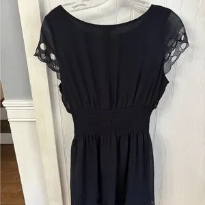 Chic navy mini dress. Features delicate lace sleeves. Smocked waist for a flattering fit.