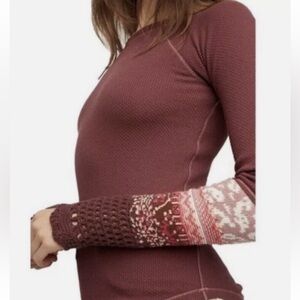 Free People NWT In The Mix Crochet Bohemian Embroidered Long Sleeve, Crewneck, Thermal Waffle Knit Cotton Blend Top