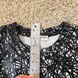 This is a casual and cool sweatshirt with a graphic print on the upper half of a heather grey French terry. It’s quite an edgy piece. It is 100% cotton. It is in good used condition.