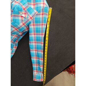 This Tin Haul women's plaid button-up shirt offers a stylish, Western aesthetic, highlighted with a vibrant, multicolor plaid pattern. The intricate Aztec-print lining inside the collar enhances its unique design appeal. Made of 100% lightweight cotton, it ensures comfort and breathability. The button closures are complemented by embroidered brand details on the sleeve, adding a premium touch. Its long sleeves and softly curved hemline make it versatile for casual or semi-casual outings. The shirt's size L fit is perfect for individuals seeking a loose but structured look, while its machine-washable care instructions ensure convenience. No holes or stains, nice and clean.