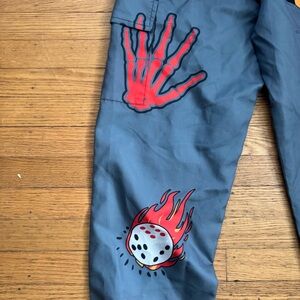 Stylish gray joggers with bold graphics. Features unique designs and vibrant accents. Worn once in very good condition.
