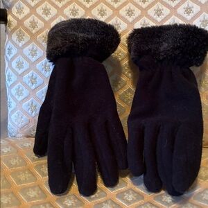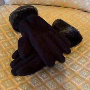 Elegant black hat and gloves set with gray fur trim. Perfect for winter fashion.