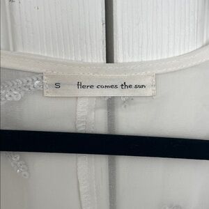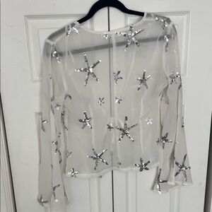Elevate your style with this sheer white top featuring stunning star embellishments. Perfect for a night out or a special occasion. Fun for concerts. Flare sleeves at the end. Disco top. Size small