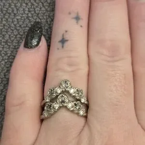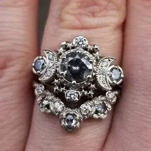 This nature inspired diamond chevron band is set with 3 beautiful natural Salt & Pepper diamond rose cut pears, they have a combined weight of approx. .21 carats. The ring has 4 tiny accent diamonds, they have a combined weight of approx. .08 carats.