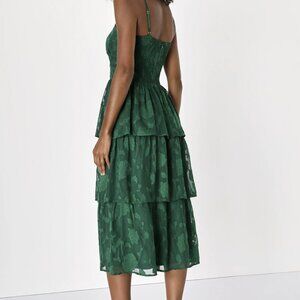 NWT Lulus Grace and Beauty Emerald Green Burnout Floral Print Tiered Dress (Sm)
