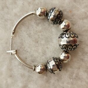 Elegant .925 Sterling silver hoop earrings featuring intricate, engraved silver balls. About 1.25 inches in diameter.