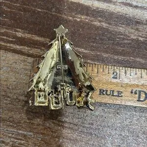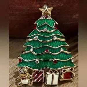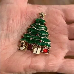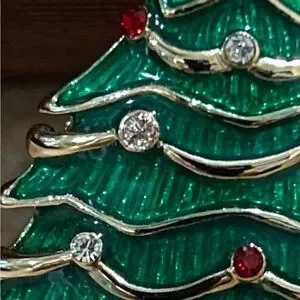 There is a stone missing but you can’t tell b/c there’s something shiny in its place. Took a close up. Enamel and crystals in gold tone.