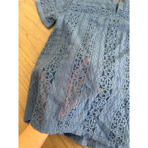 It has a button closure and keyhole opening in the back of the neck. The delicate lace has a floral pattern. This top is lightweight and comfortable.