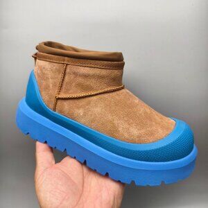 These UGG snow boots, with their distinctive blue trim, add a touch of bright color to a dull winter day.
