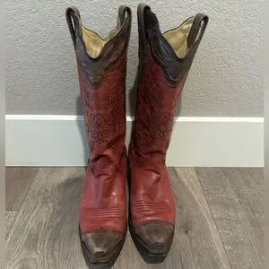 Stylish red and brown cowboy boots with intricate detailing. Perfect for a western look.