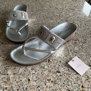 Elegant silver sandals with embellished straps. Comfortable cork sole. Perfect for any occasion.
