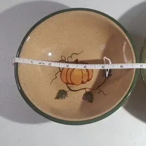 Set of two bowls featuring a pumpkin design in the bottom of a tan bowl with a green rim. Perfect for autumn decor. These are made by Buckeye Stone Wear in Zanesville, Ohio, exclusively for the Longaberger Homestead. The design is hand painted and they have a crackle finish. They are in very good previously owned condition.