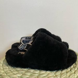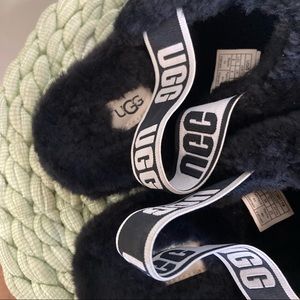 Cozy black fluffy slippers. Elastic UGG branded strap. Perfect for lounging.