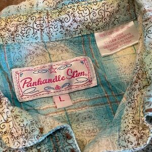 Love this Western snap up shirt by Panhandle Slim! The fabric is soft and the pattern is really cute and pretty. who doesn't love Teal? The pit to pit measurement is 19.5 inches.