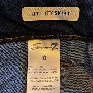 Very good condition denim skirt from Seven7. Stretchy. Size 10; measures about 17 inches across the waist and 18 inches long.
