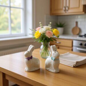 In a quaint kitchen, a pair of charming bunny shakers sit, poised like sentinels of flavor. Each bunny, one with a purple bow tie, the other in blue, tells tales of dinners past and those yet to come. Crafted from ceramic, they are ready to season your meals with whimsy.