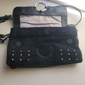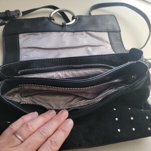Beautiful black suede crossbody bag with silver hardware and studs.
