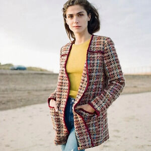 Size small, oversize fit please see measurements below Flat Lay Measurements: 19" Armpit to armpit 31" Long Colourful tweed blazer Red fringe Oversize longline fit, great as an outer layer as well 2 pockets Hidden buttons Lined 56% Polyester 33% Acrylic 11% Wool Pre-owned in excellent condition, no visible flaws ✅ Offers always welcome! 🎁 Bundle and save Anthropologie ett:twa Harlequin Boyfriend Tweed Plaid Blazer Jacket