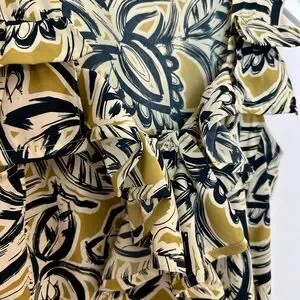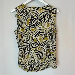 BANANA REPUBLIC Ruffle Front Sleeveless Blouse in Green, Cream and Chartreuse, Women’s size Large. This blouse has a bold blue painterly leaf pattern and is made of very lightweight 100% polyester with crystal-like button detail, so cute! It is in excellent like-new condition, see photos for additional details.