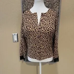 Chico's cardi with bold leopard print. Button-up front. Long sleeves with black lace trim.