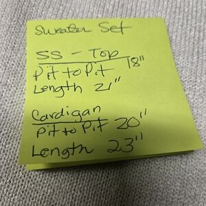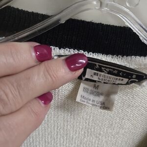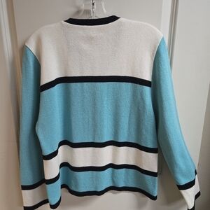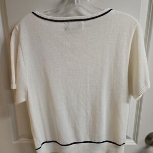 Sweater set, white shorts sleeve top with black ring on neck. Cardigan is white, black and aqua blue, button up.