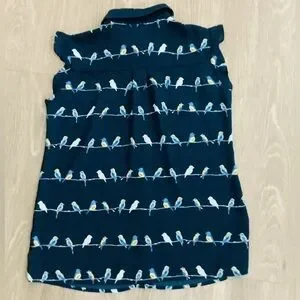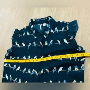 Chic Elle shirt with a lively bird pattern. Dark blue fabric with vibrant yellow and blue details. Ideal for everyday style.