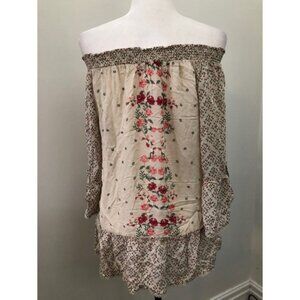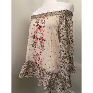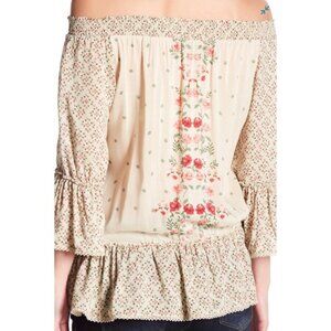 - Smocked off-the-shoulder neck - Bell sleeves - Floral design - Peplum hem