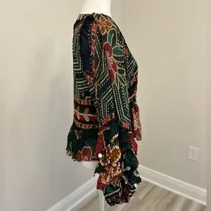 Vibrant floral top with a deep V-neck. Features ruffled sleeves and a colorful patterns. Fall 2020 collection. Coming from a smoke free pet free home. Measurements available upon request.